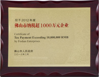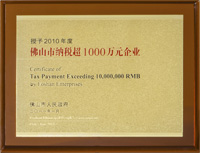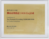 自公司成立之日起,就不断努力提高经济效益,把依法、按时、足额纳税作为企业义务和责任。2009年纳税1157万元、2010年纳税1642万元、2011年纳税1856万元、2012年纳税1910万元、2013年纳税1244万元、2014年纳税1224万元。2010年、2011年、2012年,佛山市人民政府连续三年授予公司佛山市纳税超1000万元企业荣誉。